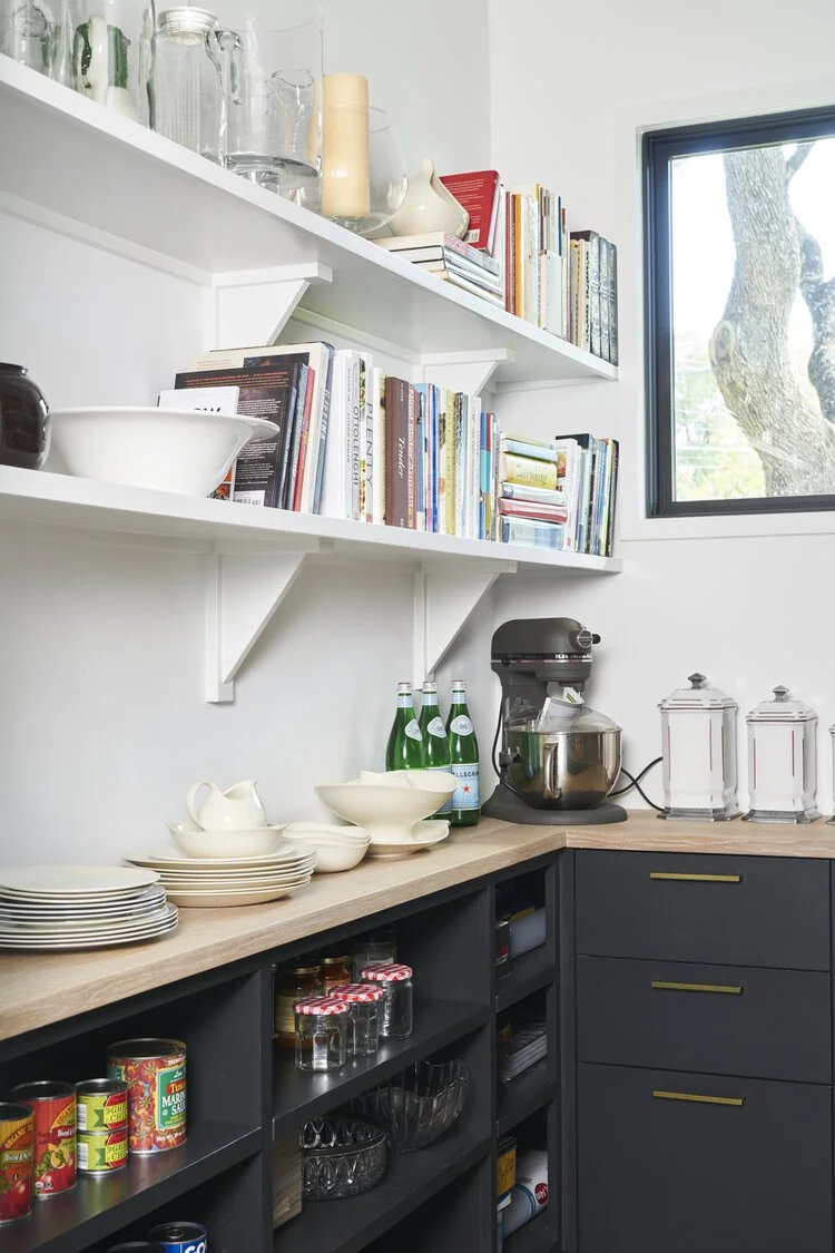 While your cabinet maker is responsible for your kitchen cabinetry, your trim carpenter can typically handle open shelving. In many cases, open shelving is less expensive than cabinetry.