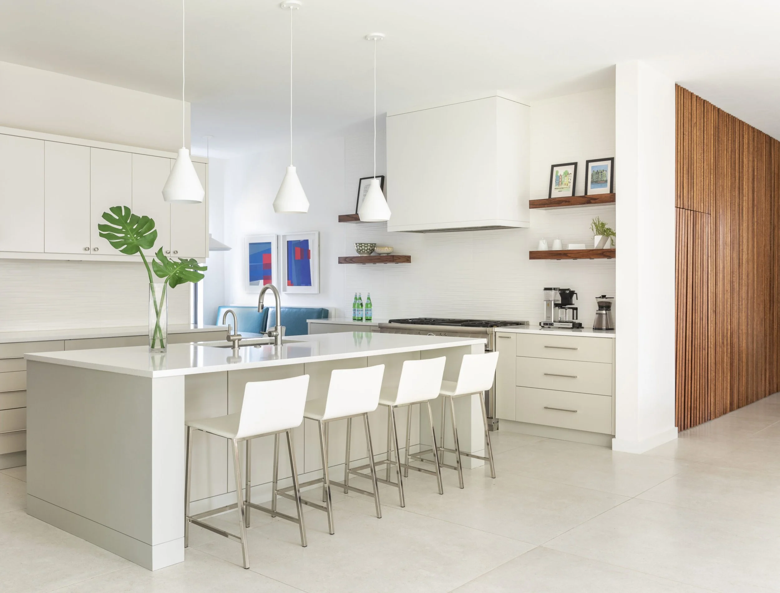 Open shelving feels visually lighter than upper cabinets. Using them can help make a small kitchen feel larger or further enhance the spacious feel of an open-concept kitchen design.