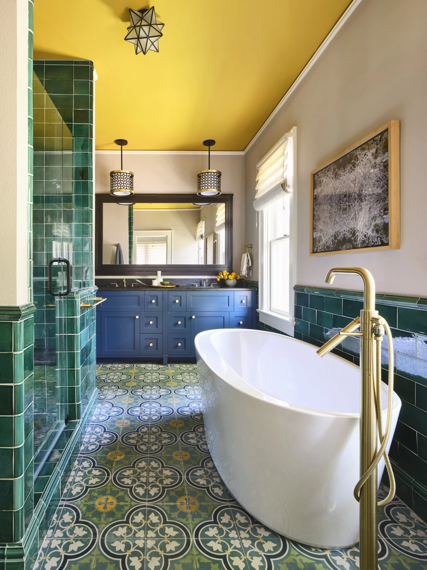A painted ceiling may seem simple, but paint options go far beyond the simple shades of white. Painting the ceiling with a bold color draws the eye upwards and creates visual contrast and interest within the room. Additionally, you can even add stenciling to the ceiling to mimic some of the French motifs Dianne came across in her travels. Make sure the color you select coordinates with all the finishes in the space for a cohesive design.