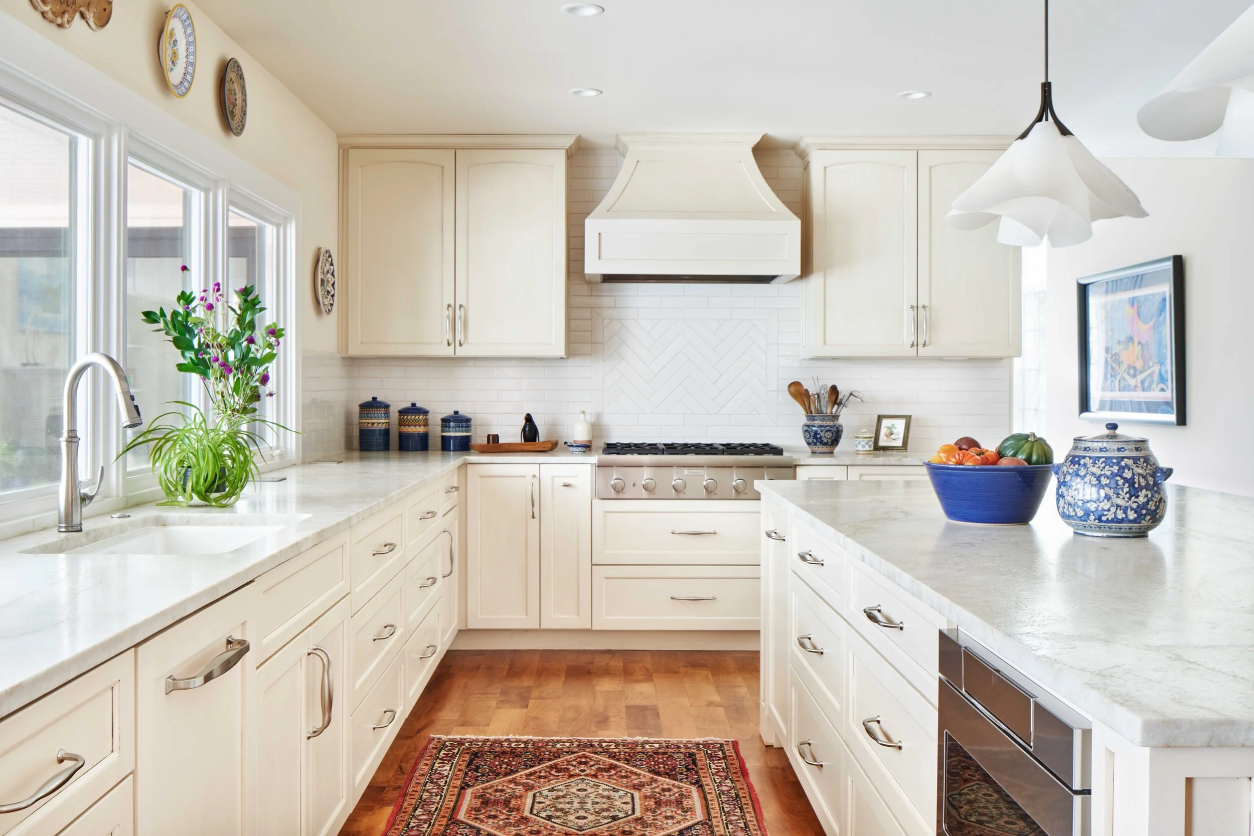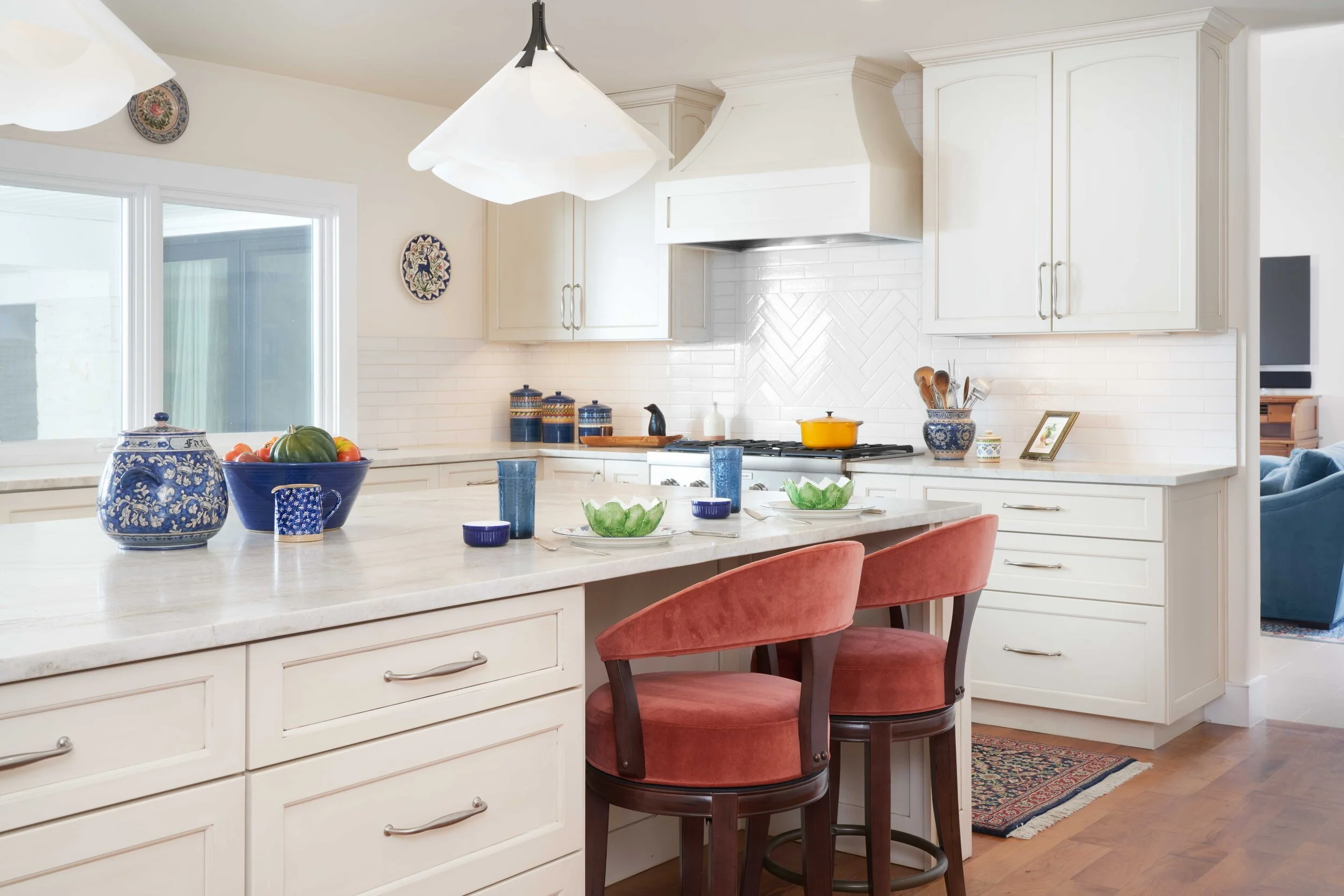 The new kitchen is now the heart of the home. Our team designed a functional open-concept kitchen with an extended footprint that includes a scullery, island, and different places to sit and relax, including a custom built-in banquette. The bright kitchen features white cabinets, a built-in pantry, quartzite counters, a Winchester tile backsplash, and a large group of multiple windows over the sink. Now, this kitchen functions with plenty of prep space while keeping a light and airy feel.