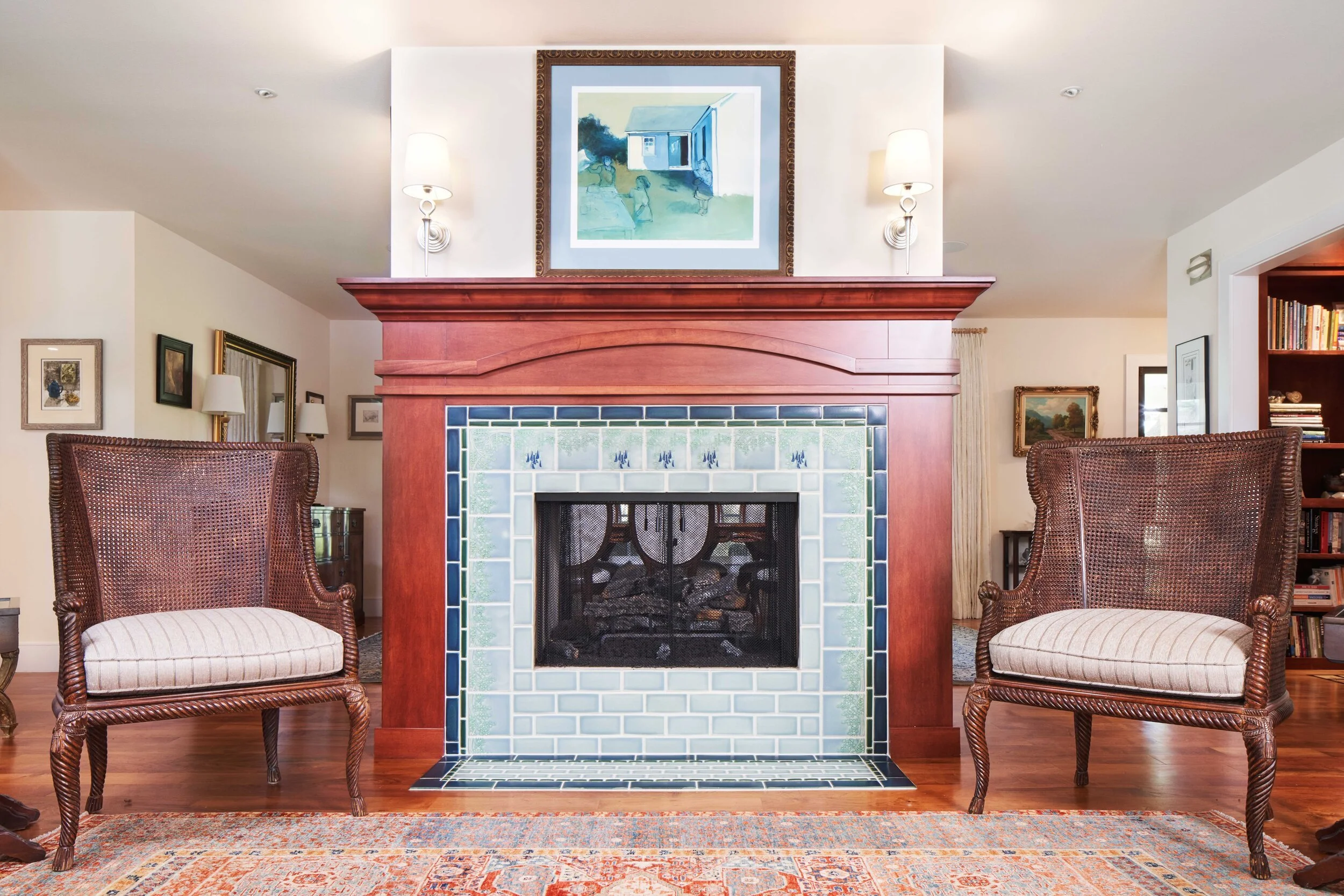 In the living and dining room, we created a double fireplace featuring Art Nouveau-inspired tilework. The client loves Art Nouveau design. However, this style doesn’t match the 1950s lines of the home’s original structure. Adding just a splash of vintage tile is a way to personalize the space while not overpowering the home’s original design.