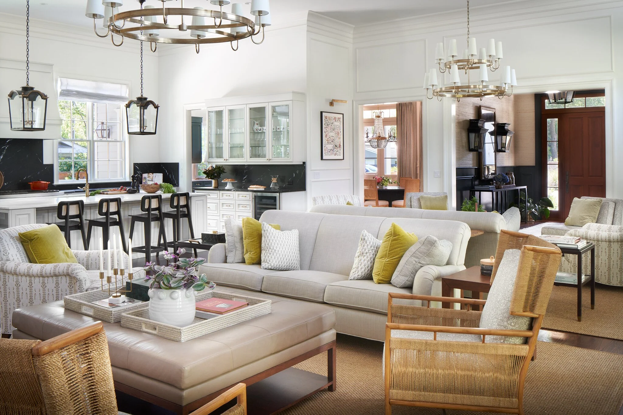 High ceilings add elegance, drama, and interest, no matter your design style. High ceilings in this home added to the bright feel and allowed the client to install oversized brushed brass chandeliers in the living space, defining the two distinct sitting areas.