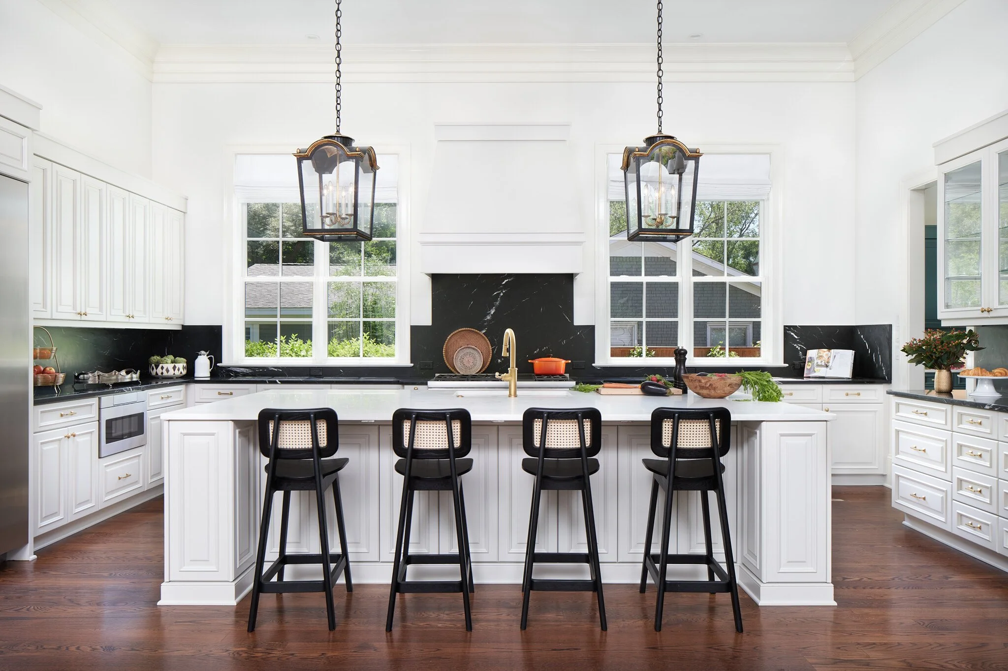 Inside, the ample open-concept living space is finished with custom-designed paneling, adding warmth, texture, and southern charm. The open-plan kitchen layout features a massive island with seating for four anchored by two large lantern pendants. White cabinetry is contrasted with black soapstone counters and matching backsplash, and gold hardware provides an elegant final touch. Off the kitchen, a walk-in pantry and scullery provide additional storage and entertaining prep space for everything from lavish dinner parties to casual evenings.