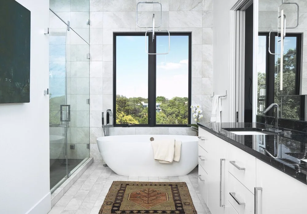 Black metal-clad windows are positioned throughout the home to frame the landscape like art. Since the property’s views were the focus of the design, our Austin architects decided to call attention to their importance by contrasting the black frames with white stucco. These exterior color choices highlight the values of the home while creating a sleek modern appearance.