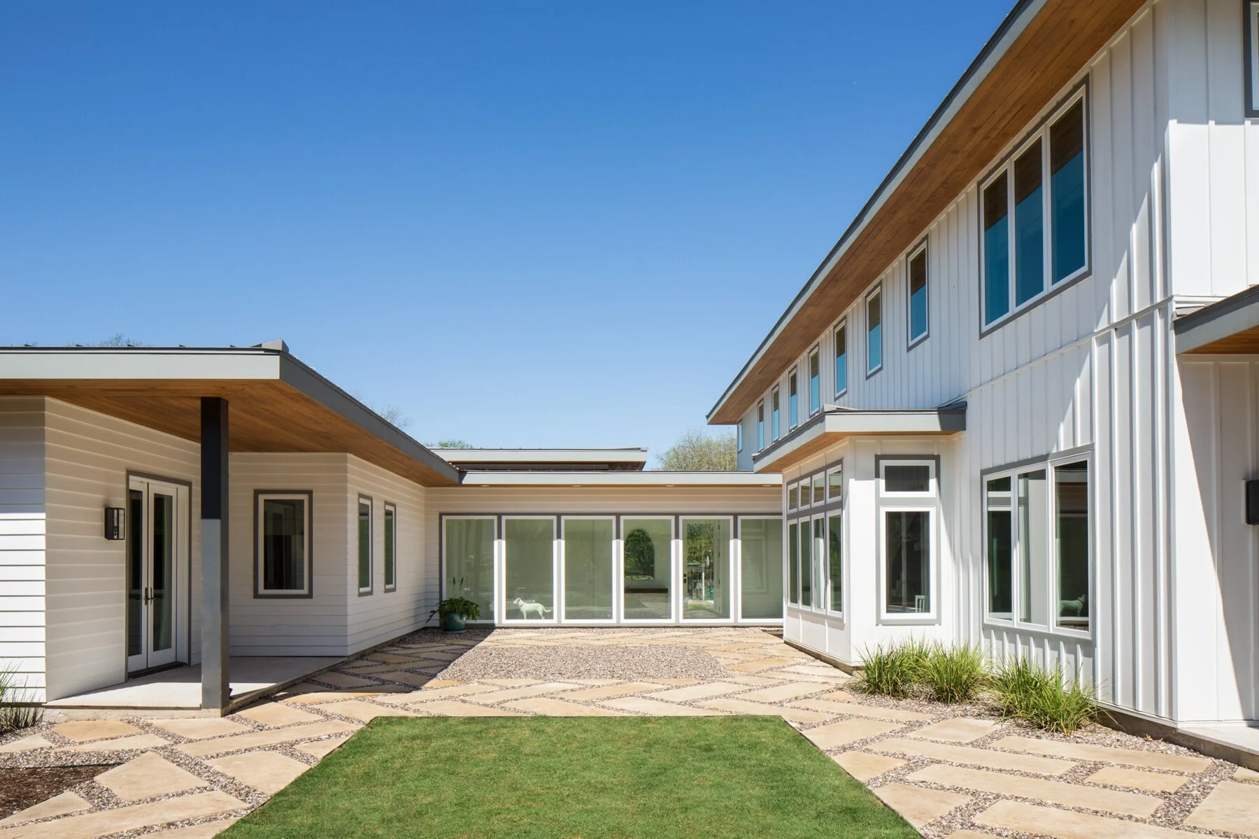 The Woodview home is a 4,500-square-foot residence comprising three distinct and private zones centered around a shared courtyard, including the main family living space, attached grandmother’s suite, and private office. Our architects designed the home in the transitional style, combining elements of modern architecture mixed with traditional finishes, including board and batten siding, light hardwood floors, and paneled kitchen cabinets. The result is a warm yet minimalistic look popular in Austin home design.