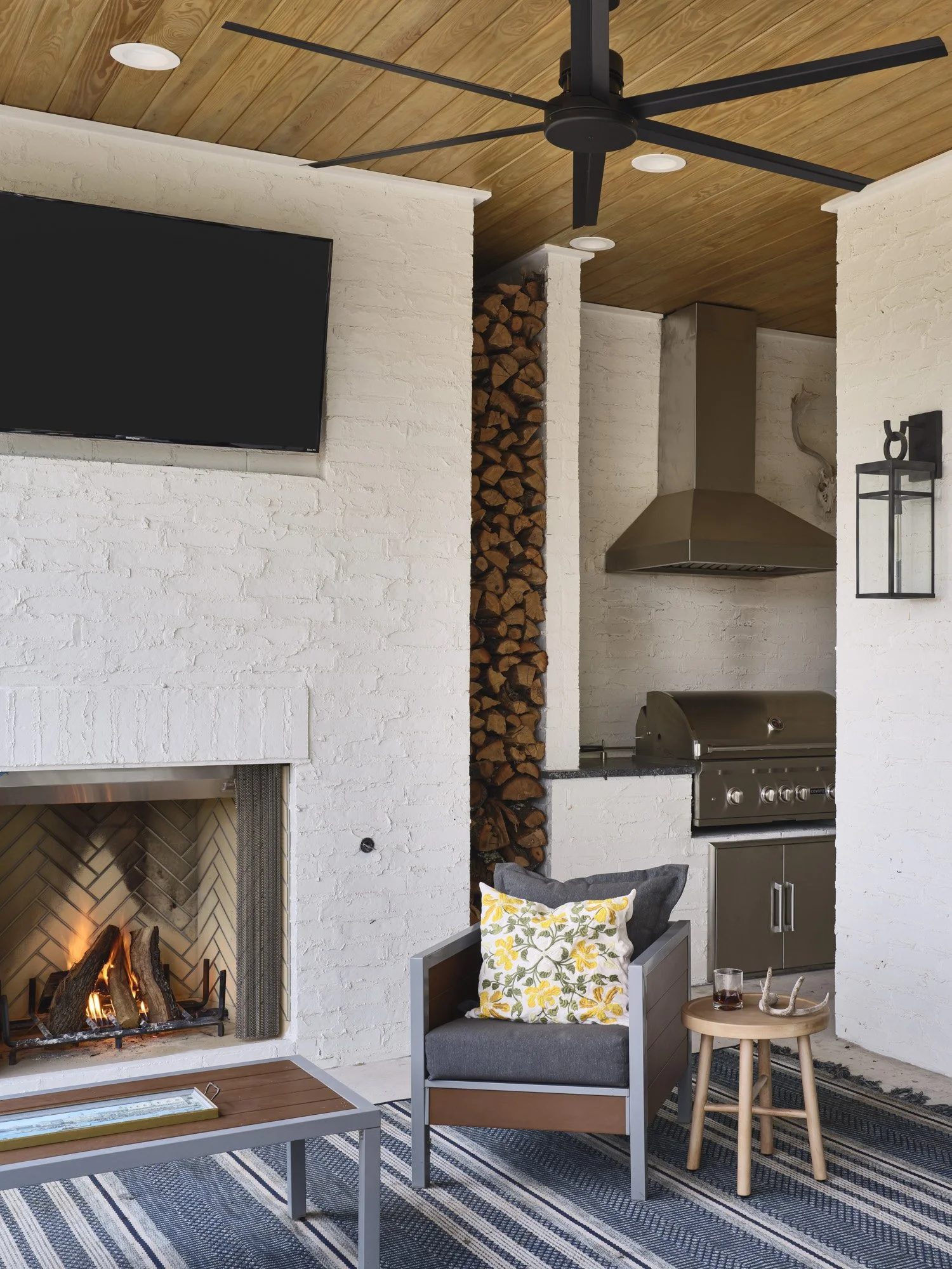 The Palo Pinto Ranch challenged our Austin architects to create a new construction lodge with a rustic character that would feel integrated and at peace with the property’s mature landscape. This new build project serves as the weekend home for the family who has owned the rural ranch property for generations. In order to achieve a rustic look that felt at one with the site and reflected the history of the land, we sourced all of the natural stone used for the build and timber used for wood accents from the property itself, mimicking an age-old construction process for a home designed for modern living. Stone found on the ranch was used on the exterior base, kitchen island, and massive two-story fireplace. Trees were cut and used for the exterior columns on the porch and interior accents on the fireplace. The ranch lodge features an open-concept living area, two bedrooms on the ground level, and a loft-style kids’ room on the second floor. We designed a large front porch to take advantage of the peaceful views and added a rainwater collection system able to collect, clean, and store 100% potable water for the family and work sustainably with the land. The design of this Austin retreat honors the ecosystem’s integrity and provides a beautiful living space for generations to come.
